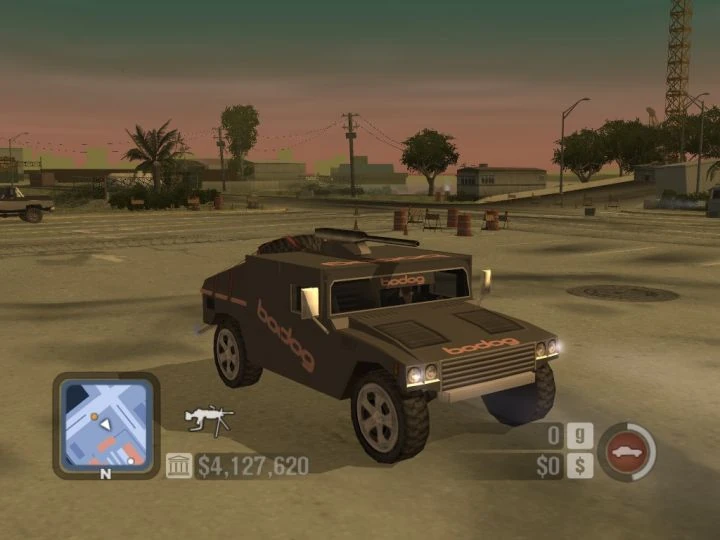 Like its standard variant, it is based on a Humvee, but it is clean and modified, it features large SUV wheels, Bodog decals, black body and a SAW gun in the top that is fixed to the vehicle.