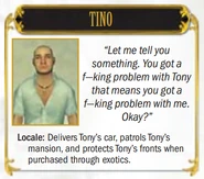 - Tino: A rare-spawning henchman in a light blue shirt. Possibly Tony's new second-in-command or bodyguard. Only appears in the Miami Distribution missions.