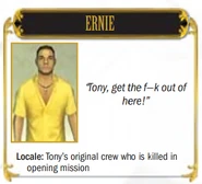 - Ernie: Henchman with the recoloured model of Carlos, gets killed in the opening mission by Juan.