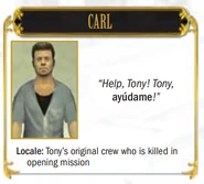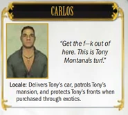 - Carlos: A Hispanic henchman with a black shirt. Tony will call him when he needs a car or boat.