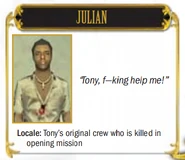 - Julian: African-American henchman who is only seen at the beginning mission, but gets killed quickly.