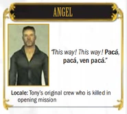 - Angel: A henchman with a black shirt. Tony will call him when he needs a car or a boat. He is named after a similar character in the movie.