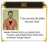 - Jose: Henchman in a pink shirt, spawns a lot of when the player needs a car or a boat.